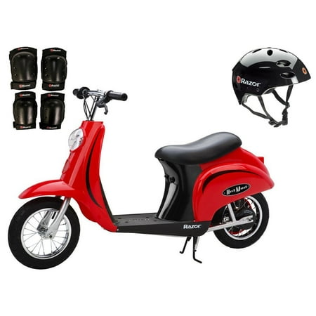 Razor Pocket Mod - Red- Vintage-inspired Mod design and high performance electric motor provide the perfect mix of utility and style- Can travel up to 10 miles on a single charge- Scaled down classic scooter design carries riders up to 170lbs- Single speed, chain driven motor for maximum power transfer- Large 12a pneumatic tires for a smooth ride- Retractable center mount kickstand- Can reach speeds up to 15 miles per hour- High Torque Motor with Chain Drive- 24V (two 12V) sealed lead acid battery system- Powerful 250 watt electric motor- Battery charge time: 12 hours- Up to 30 minutes of continuous use- UL approved battery charger- Tools included- Color: Red- Product Weight: 59 lbs- Assembled Product Dimensions: 50" x 18" x 30"- Ages: 13+- Maximum rider weight: 170 pounds- Part: 15130656- Warranty: 90 day Razor warranty against product defects- Razor Safety Helmet- Make sure to keep your kids safe during playtime- Great for biking, skating, scooter riding and more- Ergonomic interior padding is comfortable and secure- 17 top and side vents allows airflow and helps riders keep a cool head on hot days- Side release buckles adjust and fasten quickly- Sleek gloss black color- Fits head sizes 22 to 23.5 inches- Complies with CPSC standards- Ages: 8-14 years- Part: 97778- Razor Pro Elbow &