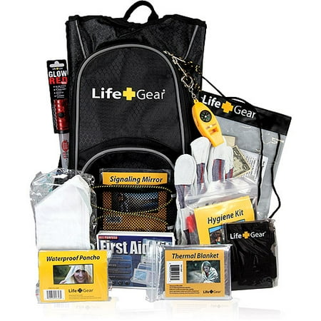 Life Gear "Day Pack" Emergency Survival Kit with Emergency Gear and First Aid Kit: Water resistant backpackErgonomically designed for children and adultsDesigned for everyday useEmergency kit includes: Emergency first aid kitDirectional compassAll-weather ponchoSignaling mirrorWriting pad and penWaterproof document/cash bagSignaling whistleThermal blanketLeather working glovesRespirator mask4 in 1 LED glow stick/LED flashlight/flasher and whistleHygiene kit