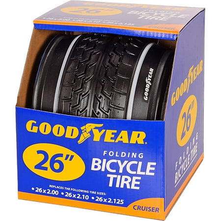 26" x 2.125" Goodyear White Pin Stripe Cruiser Tire: Flexible beadFolding bike tire features supple sidewallsFits any 26" cruiser bikeOfficial Goodyear tireReplacement partFoldable designMade of rubber